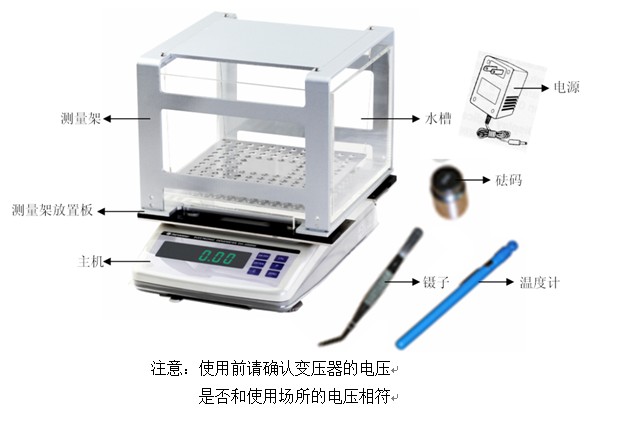 ①主機(jī)、②水槽、③測量臺、④鑷子、⑤溫度計、⑥電源變壓器一個、⑦1000g砝碼一個