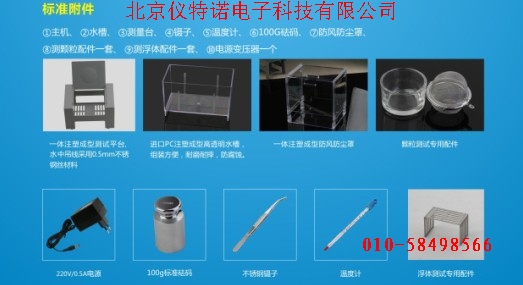 ①主機(jī)、②水槽、③測量臺、④鑷子、⑤溫度計(jì)、⑥砝碼、⑦防風(fēng)防塵罩、⑧測顆粒配件一套、⑨測浮體配件一套、⑩電源變壓器一個