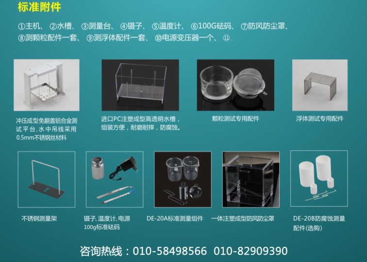 主機一臺、鑷子一支、溫度計一支、砝碼一個、防風防塵罩一套、固體水槽一個、固體測量臺一件、測顆粒裝置一套、測浮體配件一套、液體測量放置板一塊、液體測量支架一個、DE-20A標準液體測量組件一套、電源變壓器一個