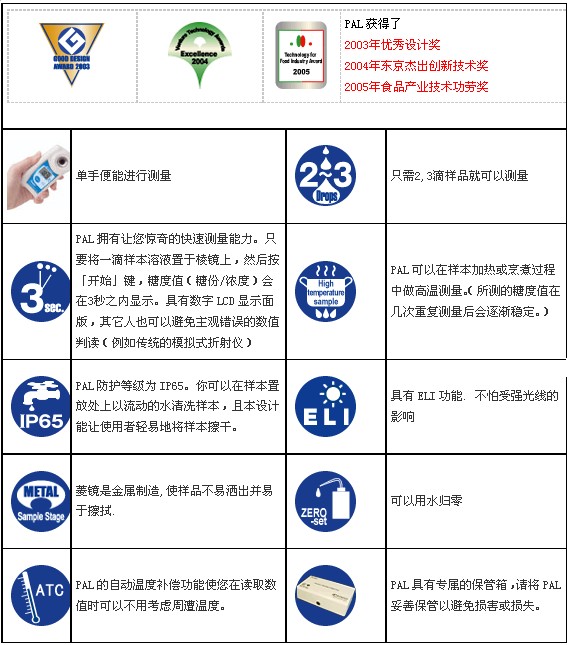 PAL是全新與數(shù)字手持儀器經(jīng)過(guò)重新設(shè)計(jì)的產(chǎn)品,且將改變傳統(tǒng)折射儀的概念。PAL的產(chǎn)品特色如下: PAL的袖珍型大小將能讓您隨身攜帶,并且不論廠房?jī)?nèi)外均能使用。本產(chǎn)品只有一百公克重,能夠輕松地放入口袋或掛在脖子上或腰帶上。